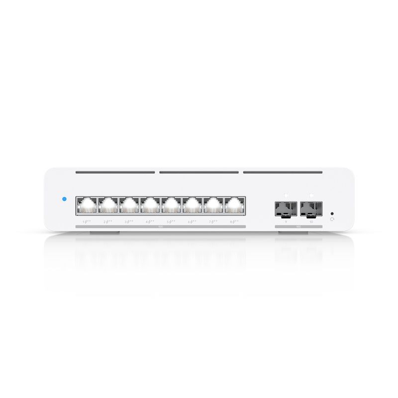El Ubiquiti UniFi Switch Pro XG 8 PoE es un switch de capa 3 gestionado, compacto y de grado profesional, que cuenta con ocho puertos RJ45 10G PoE++ y dos puertos SFP+ 10G para enlaces ascendentes de fibra de alta velocidad.